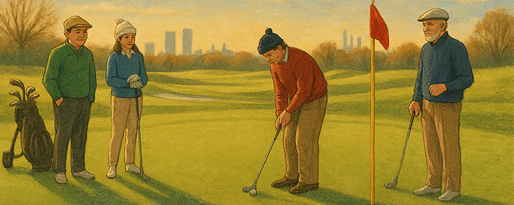 En el hoyo 9, un par 3 corto pero traicionero, decidieron hacer una pequeña competición amistosa: quien dejara la bola más cerca de bandera invitaría a los demás a un chocolate caliente en la casa club. Era una excusa perfecta para picarse un poco, para sentir la chispa de la competición sin perder la esencia del día. Lucía pegó un hierro impecable que botó suave y se quedó a tres metros. Ramón, con su swing pausado, la dejó a dos. Marcos falló por la derecha, riéndose de sí mismo antes incluso de que la bola tocara el suelo. Javier respiró hondo. No jugaba por ganar, pero hacía tiempo que no sentía esa mezcla de nervios y alegría. Pegó un golpe limpio, recto, que cayó a un metro de bandera. Los demás aplaudieron como si hubiera metido un hoyo en uno.