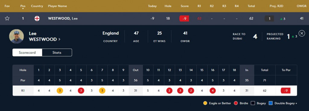 Hoy el inglés ha terminado con una espectacular vuelta de 62 impactos entregando una tarjeta sin error con dos eagles en el 3 y en el 7 y cinco birdies en el 5, 12, 13, 14 y 16 que le han llevado al liderato en solitario y a una posición de privilegio que intentará mantener mañana en la segunda jornada de este torneo que ha terminado en sus primeros dieciocho con la clasificación muy apretada en la parte alta de la tabla.