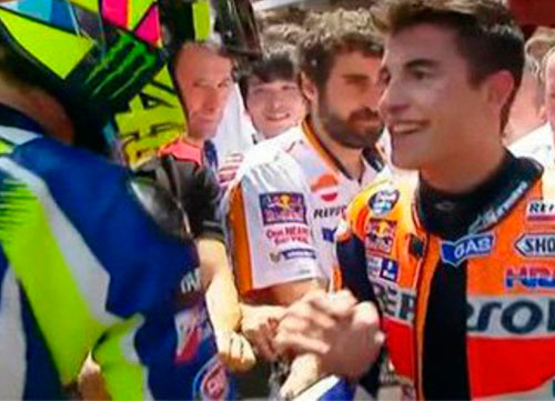 Ha sido iniciativa de Valentino y el gesto, que los aficionados llevábamos esperando desde hace meses, se produce, según palabras del piloto italiano, despuéss de pensar mucho cómo reconducir una situación enquistada desde su desagradable incidente de la pasada temporada: "Esta noche pensé que necesitamos estar tranquilos y relajados. Este es un deporte fantástico, es nuestra pasión, pero también es peligroso. Necesitamos un comportamiento normal y cordial con todos los pilotos".
